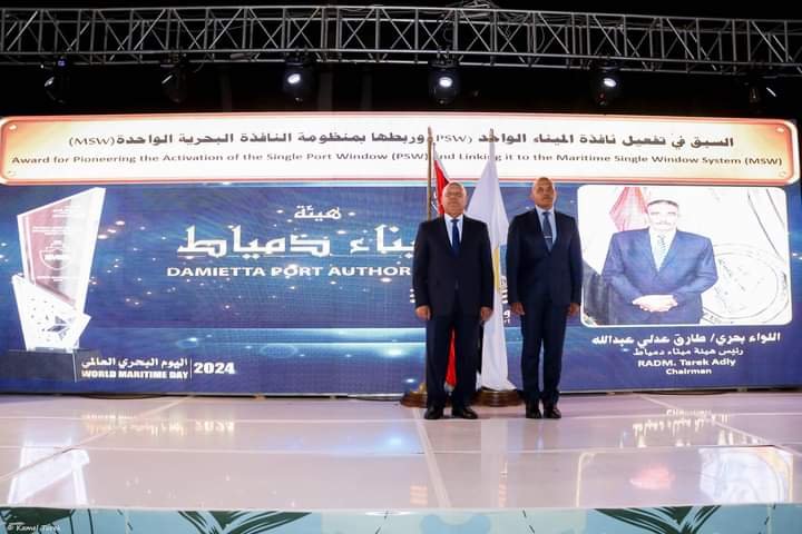 تتويجًا لجهود هيئة ميناء دمياط فى تعظيم الاستفادة من بنيتها التكنولوجية فى مجال نظم المعلومات والتحول الرقمى وخبرتها القوية فى هذا المجال، فاز الميناء بجائزة السبق في تفعيل النماذح الإليكترونية للاتفاقية الدولية لتيسير المرور البحرى FAL وربطها بمنظومة النافذة الواحدة، وذلك خلال إحتفالية اليوم البحرى العالمى 2024 التى أقيمت هذا العام تحت شعار الملاحة فى بحار المستقبل السلامة أولًا بالأسكندرية تحت رعاية الفريق مهندس كامل الوزير نائب رئيس مجلس الوزراء للتنمية الصناعية وزير الصناعة والنقل، وحضور الفريق أحمد خالد محافظ الإسكندرية، الفريق أسامة ربيع رئيس هيئة قناة السويس، اللواء بحرى نهاد شاهين نائب وزير النقل، الدكتور إسماعيل عبد الغفار رئيس الأكاديمية العربية للعلوم والتكنولوجيا والنقل البحري، اللواء بحرى طارق عبدالله رئيس قطاع النقل البحري واللوجستيات، محمد مصيلحى رئيس اتحاد غرف الملاحة العربية، أحمد الوكيل رئيس الاتحاد العام للغرف التجارية، ورؤساء الموانئ، ولفيف من خبراء النقل البحري والمجتمع الملاحى وأعضاء السلك الدبلوماسي.