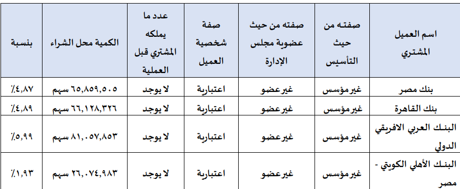 وكانت كشفت شركة “طاقة عربية”، تفاصيل صفقة نقل ملكية التي نفذت على أسهم الشركة خلال جلسة اليوم الثلاثاء، في إطار تسوية مديونيات مع البنوك الدائنة.