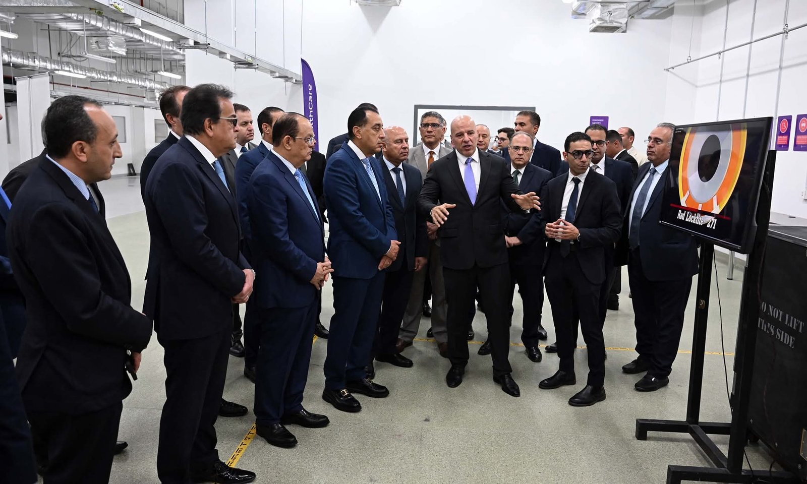 ورافقه خلال جولته التفقدية بموقع المشروع، الدكتور خالد عبد الغفار، نائب رئيس مجلس الوزراء للتنمية البشرية، وزير الصحة والسكان، والفريق مهندس/ كامل الوزير، نائب رئيس الوزراء للتنمية الصناعية، وزير الصناعة والنقل، والمهندس/ عادل النجار، محافظ الجيزة، والدكتور علي الغمراوي، رئيس هيئة الدواء المصرية، والدكتور هشام ستيت، رئيس الهيئة المصرية للشراء الموحد والإمداد والتموين الطبي وإدارة التكنولوجيا الطبية.