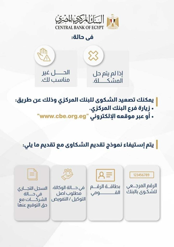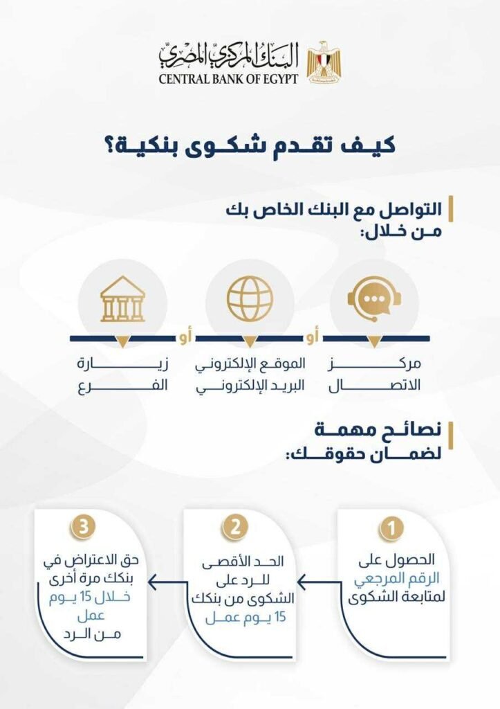 أوضح البنك المركزي المصري، في إنفوجرافيك ، خطوات تقديم عملاء القطاع المصرفي للشكاوى البنكية، وقدم 3 نصائح لضمان حقوق العملاء، كما قام بشرح خطوات تصعيد الشكوى إلى البنك المركزي والمتطلبات الواجب استيفائها لتقديم الشكوى.