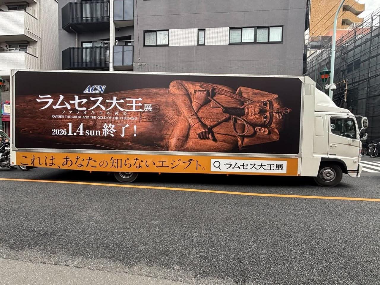 في ضوء ما يشهده معرض “رمسيس وذهب الفراعنة” المقام حاليًا في العاصمة اليابانية طوكيو، من نجاح كبير وتوافد ألاف الزائرين من مختلف المدن اليابانية لزيارته، وفي إطار الحملة الترويجية الخاصة بالمعرض، تم إطلاق شاحنة دعائية متنقِّلة (Senden Truck) تجوب الشوارع الرئيسية في طوكيو وعدد من المدن اليابانية الكبرى، بهدف رفع الوعي الجماهيري بالمعرض واستقطاب المزيد من الزوار.